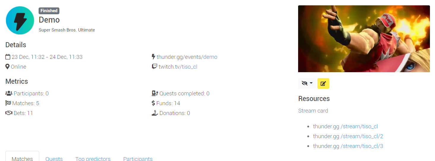 Debes poner en “Stream” la visibilidad del match que quieres que aparezca en la tarjeta. Si pones otro en el mismo evento, se quitará el anterior y se actualizará al nuevo.